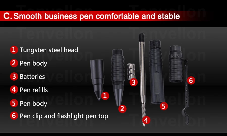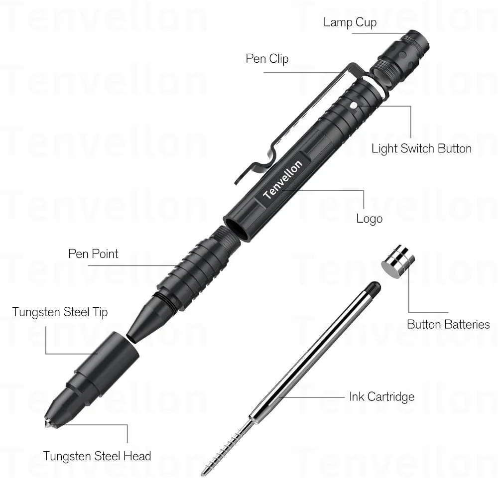 Tenvellon Self Defense Supplies Tactical Pen Flashlight Writing Safety Security Protection Personal Defense EDC Defensa Personal Brand Tenvellon self-defense product service guarantee: Specifications: