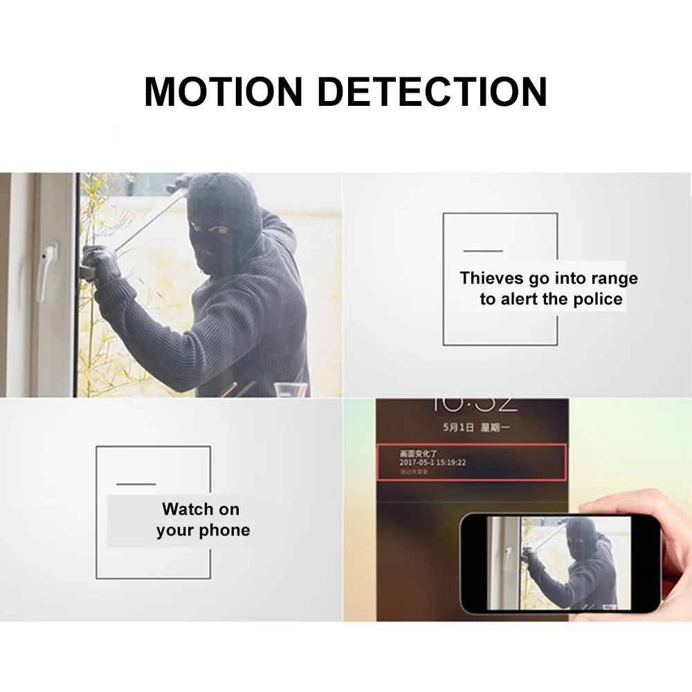 With the upgraded intelligent motion detection, the small wifi nanny cam allows you set the sensor sensitivity manually. Once a motion is detected, the mini camera will send Push Notification with images to your phone for remote view when you left home.