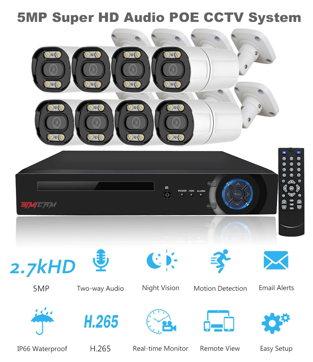 1. OurNew 5MP POE Camera System. 8 Channel NVR Design, Support To Connect Up To 8pcs Cameras, You Can Buy simicam POE IP Cameras To Expand Your CCTV System.