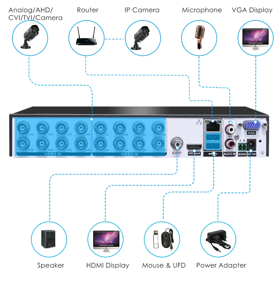 | Hiseeu16CH 5in1 AHD DVR for CVBS TVI AHD Analog IP Camera CCTV NVR P2P Cloud H.264 VGA HDMI Security System Video Recorder Audio |