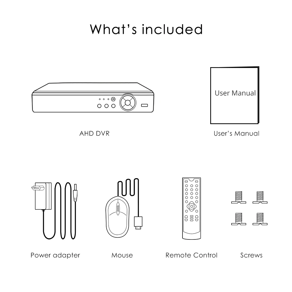* 1 x 16CH DVR* 1 x 12V Power Adapter* 1 x Remote Control* 1 x Mouse * 1 x User ManualSome Screws*** 1TB HDD is optional *** Specifications: