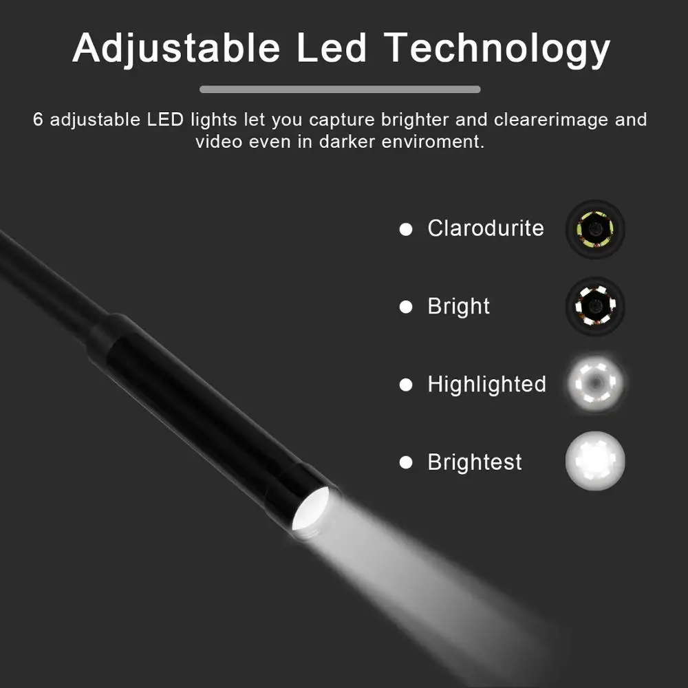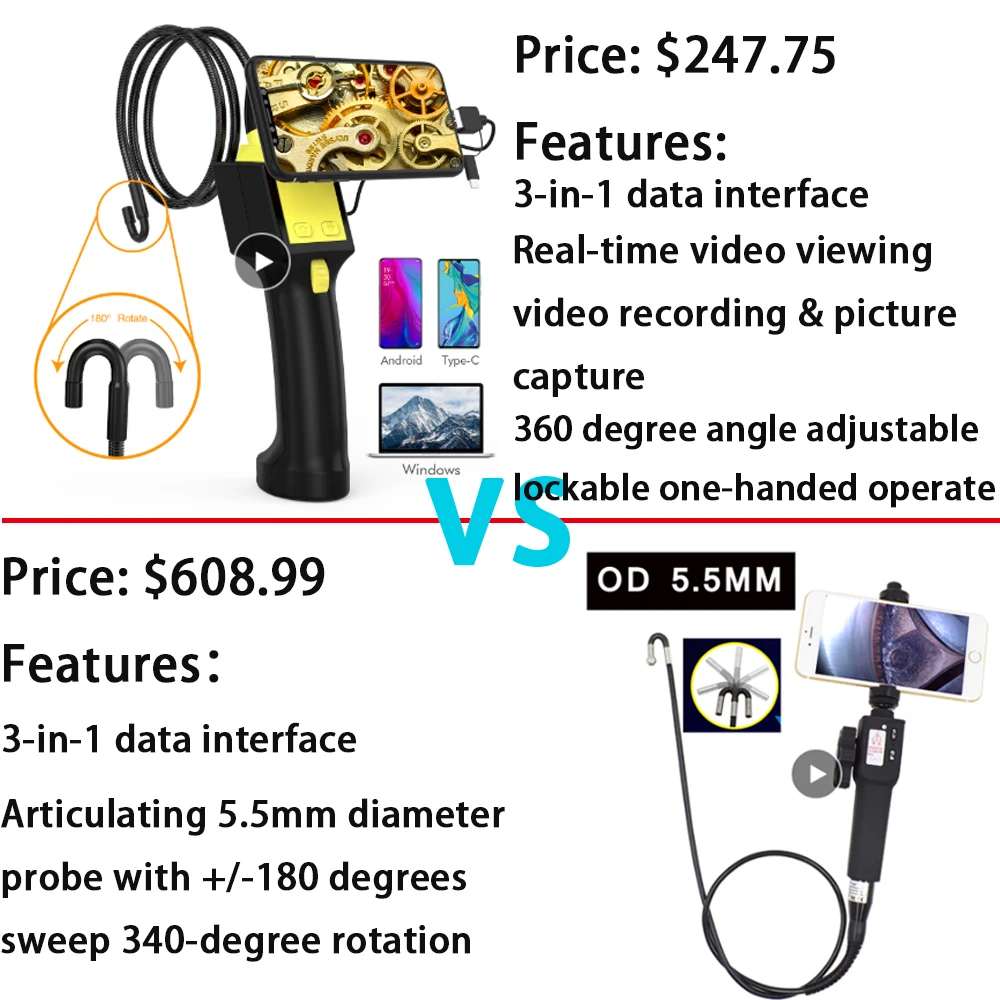 1.3-in-1 data interface(Type-C/USB/MICRO)2.Real-time video viewing.video recording and picture capture3.High brightness LED lamp,five adjustable brightness Portable camera button for quick photo taking during easy use 4.180 or 360 degree angle adjustable lockable one-handed operation,Quick and convenient.Digital Endoscopic Camera Application: