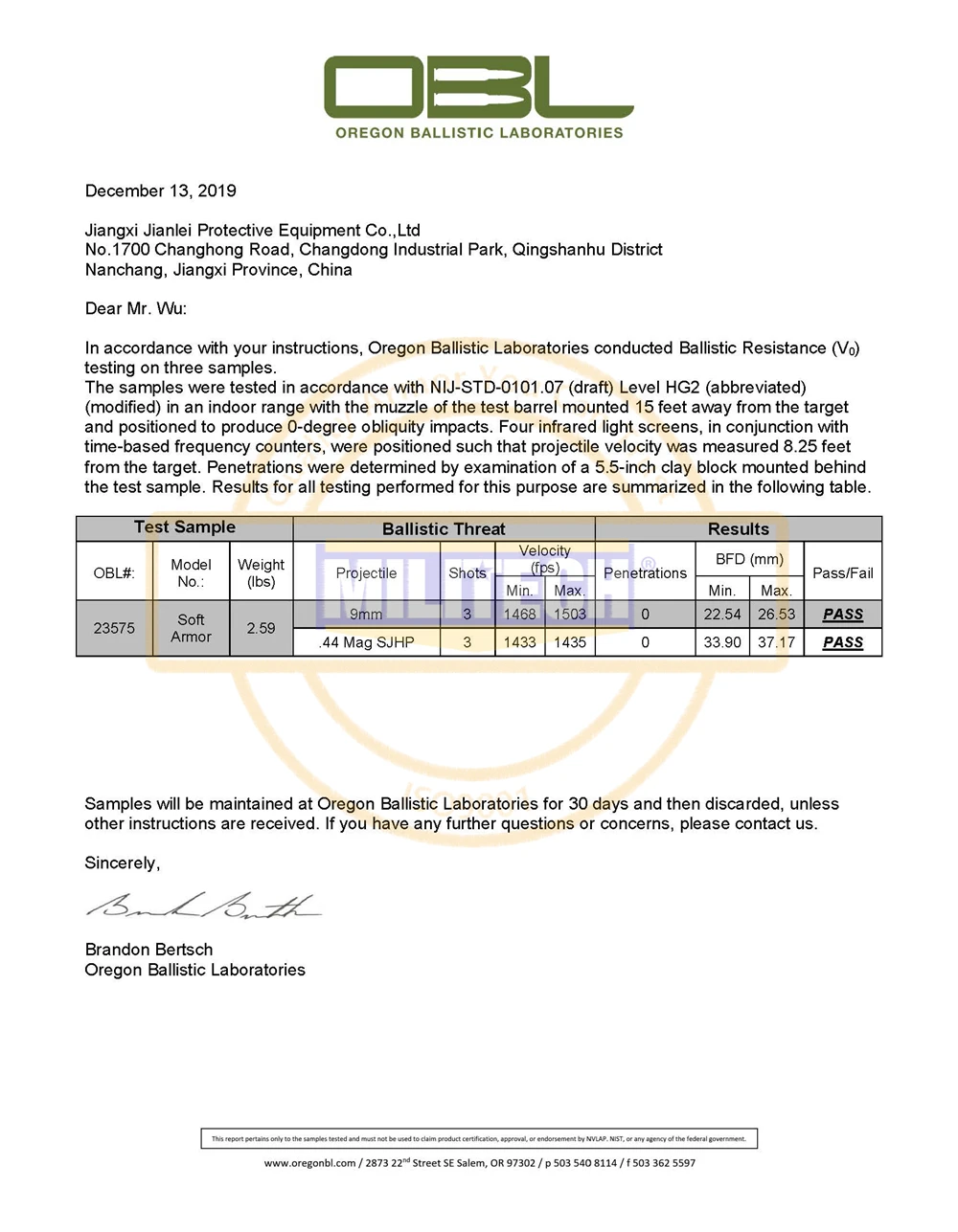 Click Here To Watch Militech Aramid Soft Panel's NIJ 0101.7 HG2 & NIJ IIIA 0101.06 .44Magnum Test VideoNote: The latest test was performed by OBL of USA in December, 2019
