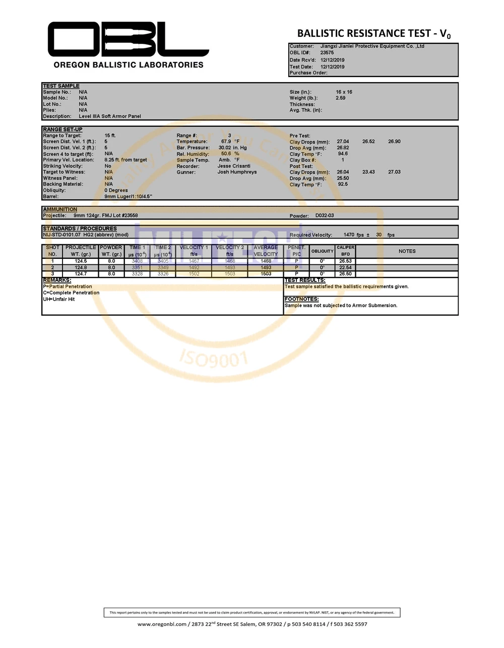 Click Here To Watch Militech Aramid Soft Panel's NIJ 0101.7 HG2 & NIJ IIIA 0101.06 9mm Test VideoNote: The latest test was performed by OBL of USA in December, 2019