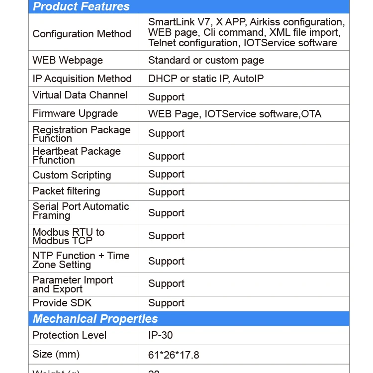 - Support Easy Configuration Through Web Interface or PC IOTService Tool