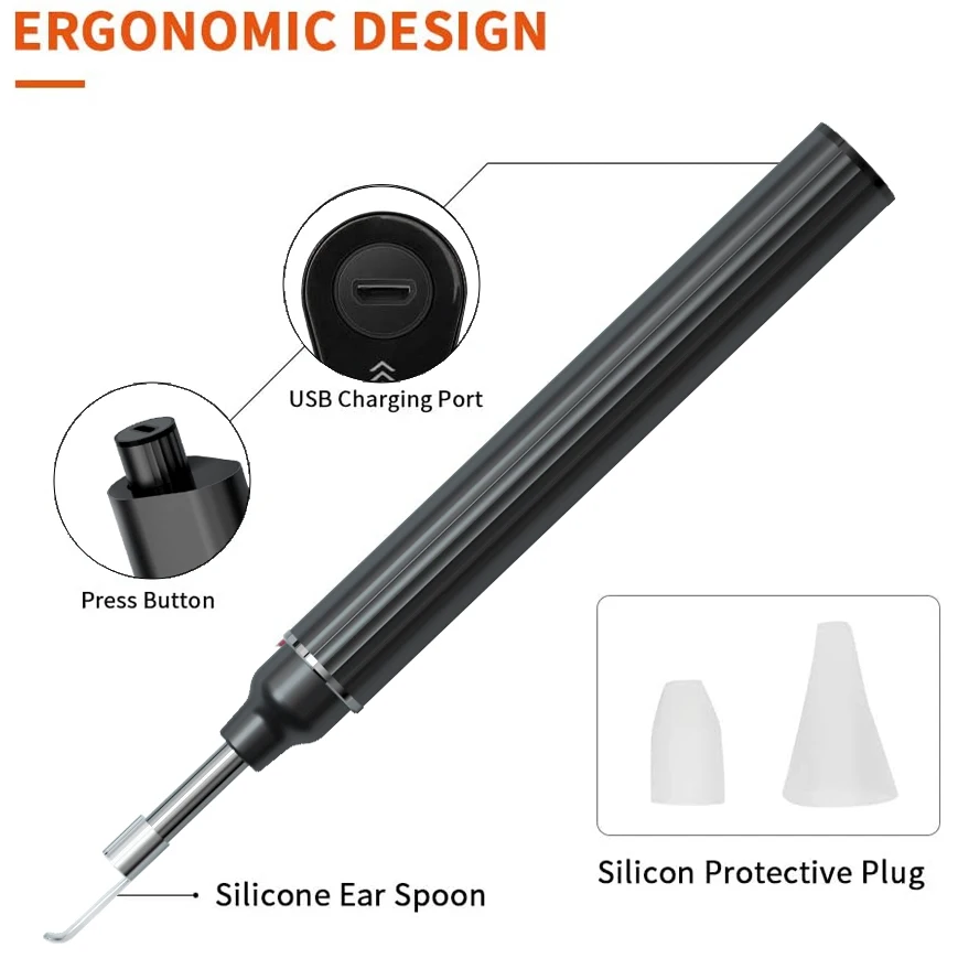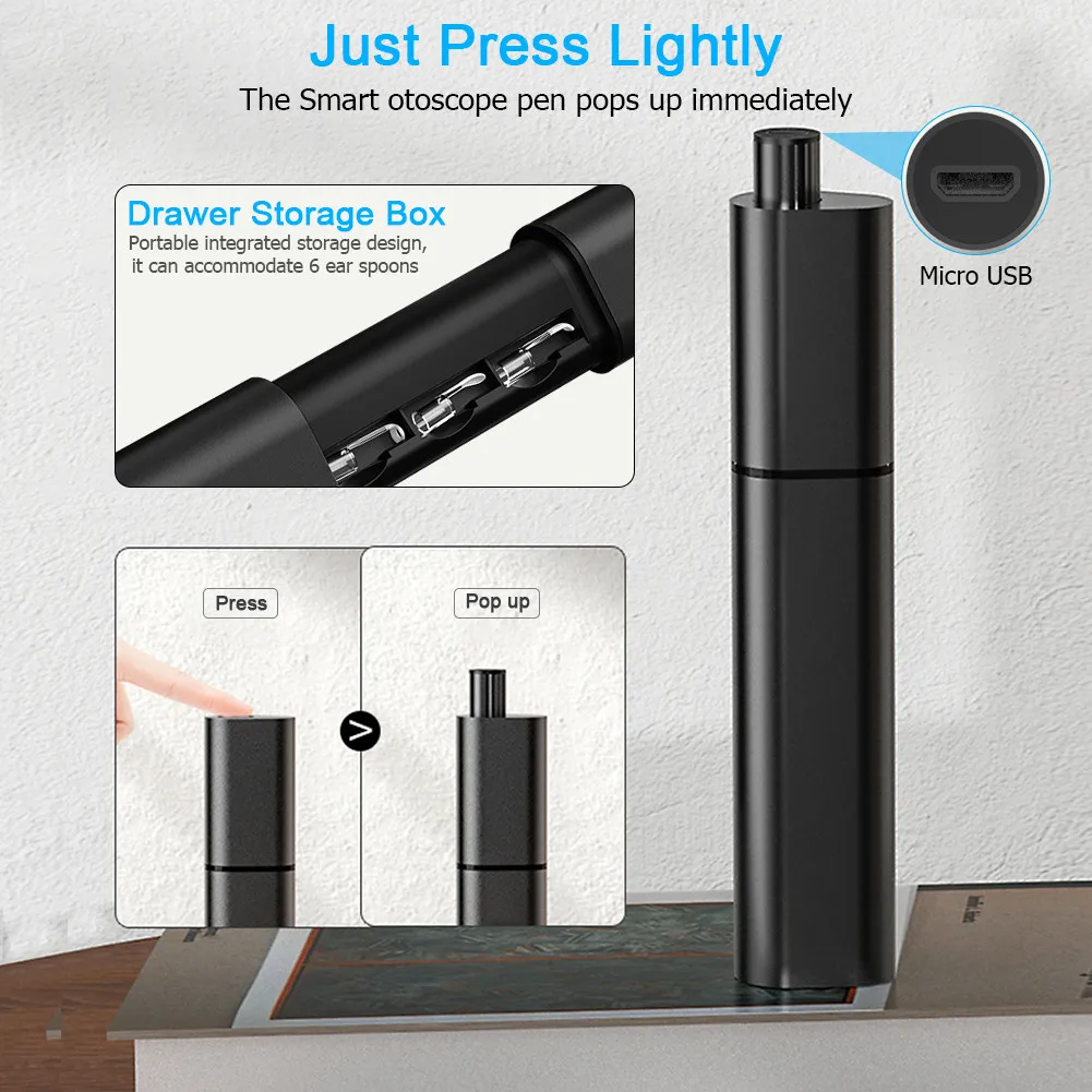 1. Adopt push-type switch design, easy to operate2. Built-in accessory slot, portable integrated storage is safer and healthier3. Built-in chip compensation algorithm, the imaging is more stable, and the image quality is higher.4. Adopt led cold light source, no heat, no sense operation is more at ease5. Using AI control, accurate imaging, 360 visual ear picking gives you different surprisesEar Endoscope Specification: