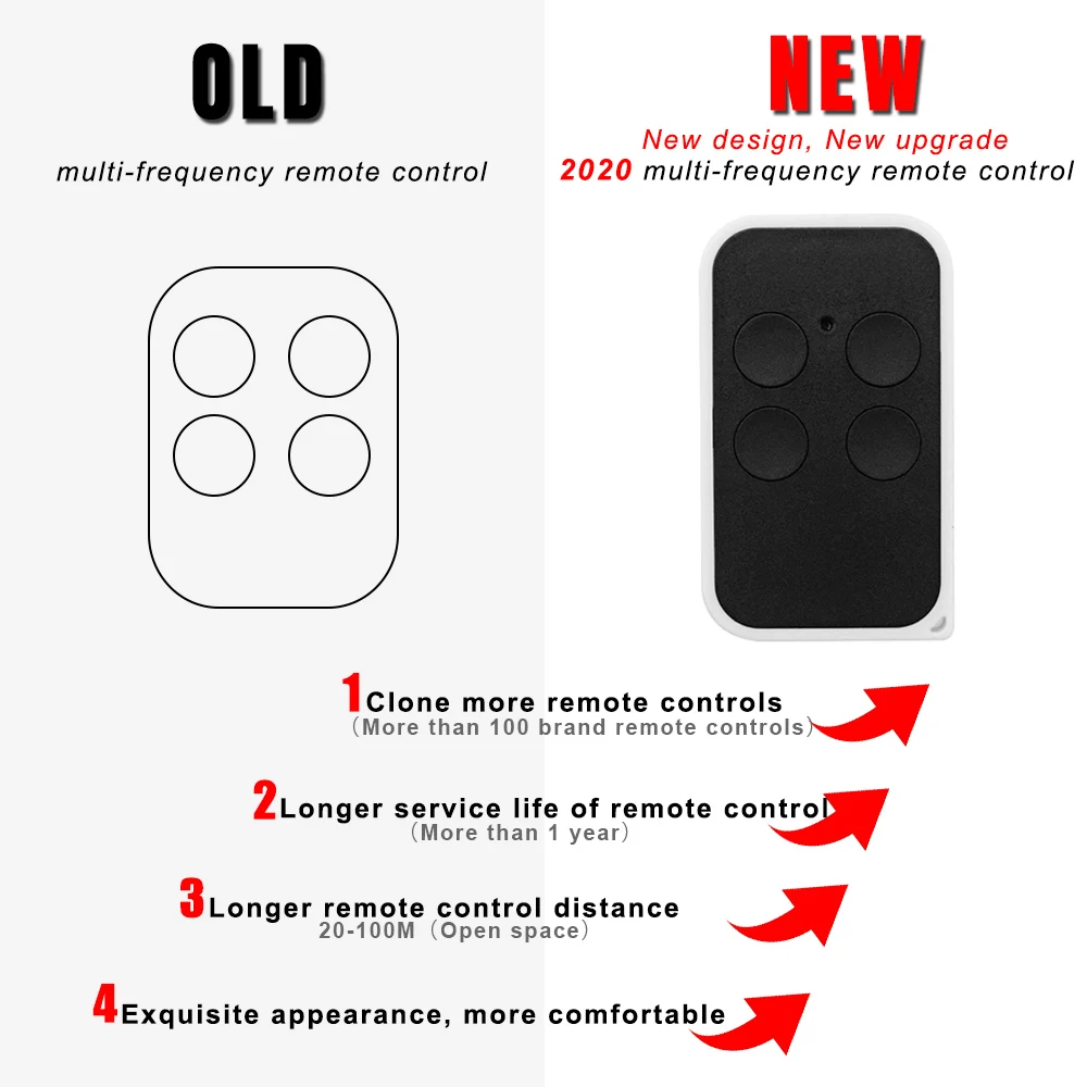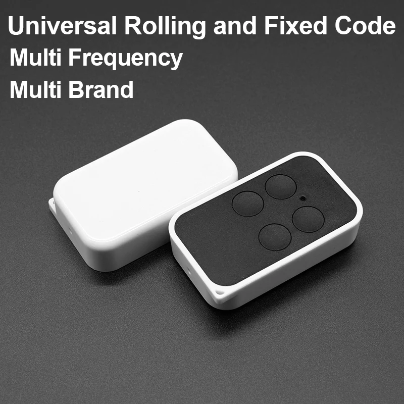 1. The latest style universal garage door remote control in 2020.2. It can compatible with Multi-brand remote controls.3. One remote control can control up to 4 different brands of remote controls.4. It can compatible with Multi frequency 280-868MHz fixed and rolling code remote controls.5. Multi-functional remote control work for 1, 2, 3 or 4 buttons remote control.6. Multi-functional and multi-variable, personalized and user-friendly simple design and fast to use.Include