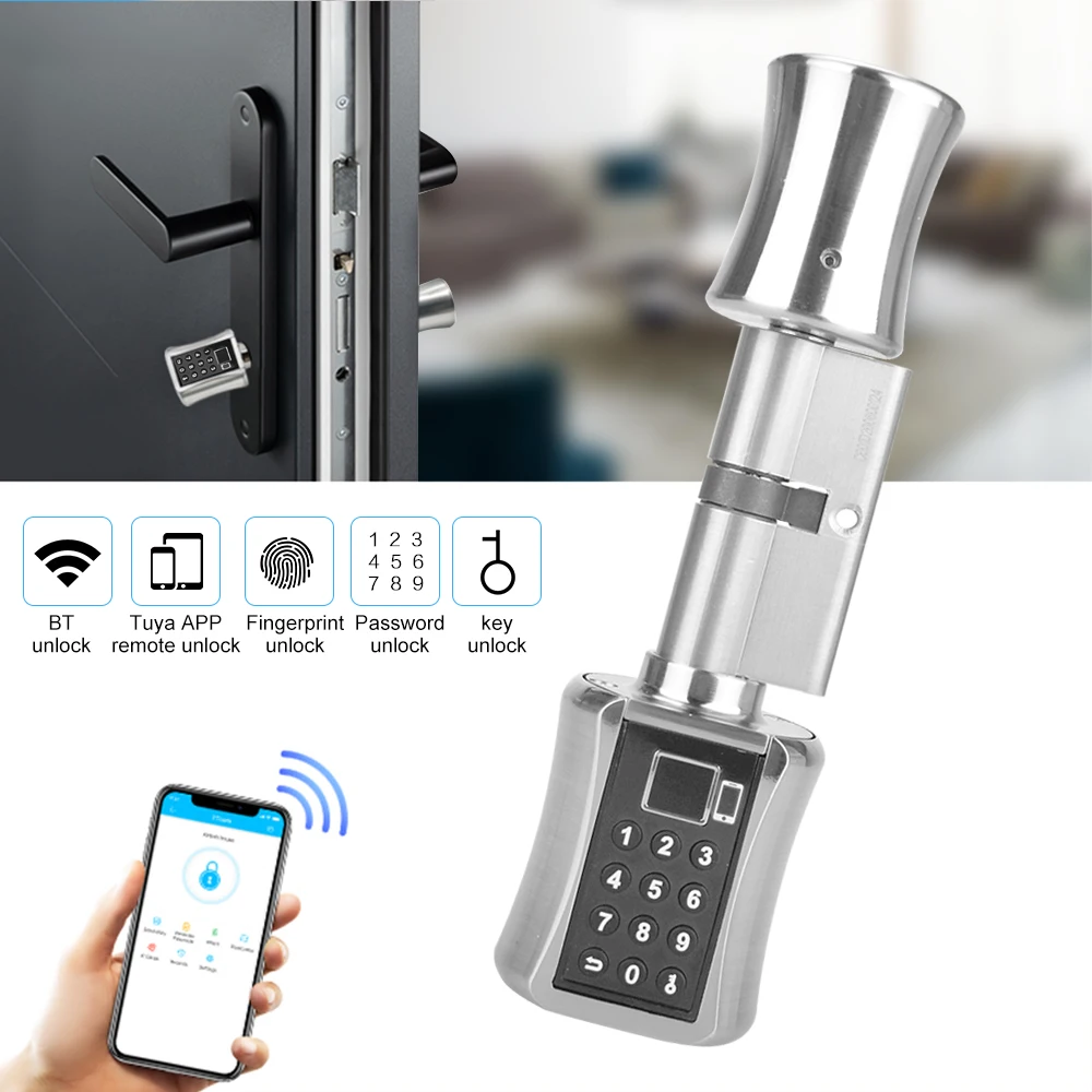 Smart Cylinder Lock With Tuya APP Keyless Electronic Fingerprint Door Lock BT Wifi Digital Password Lock Code Anti-theft Security Door Lock Core with Key Electric Lock