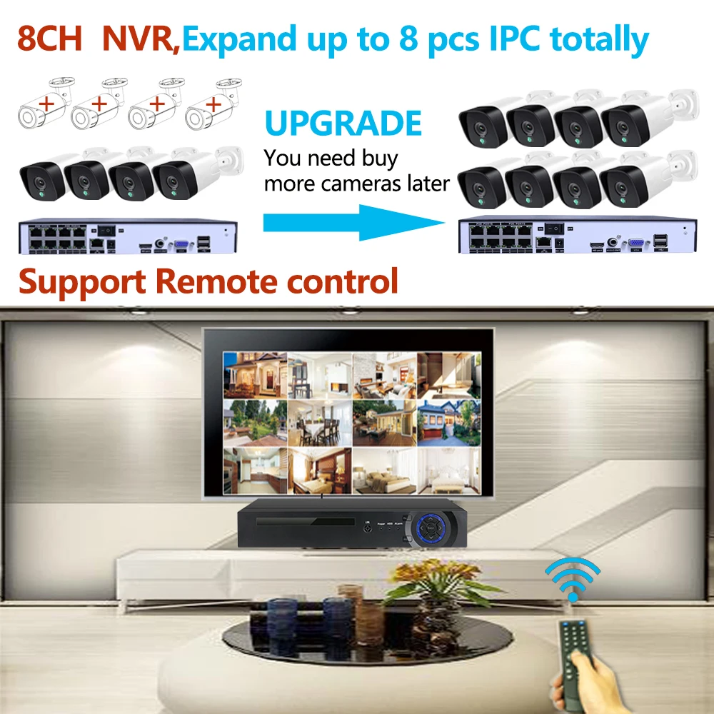Our Advantages:1. HD 5.0P Resolution;Inteligent AI Motion Detection & Face Detection;2.52V POE CCTV System maxsupport 100 meters transmission distance;3. 8 Channel NVR, support up to 8 cameras;4. POE powered / Lan Cable connection between NVR and IP Cameras;5. Metal shell housing waterproof ip camera can be used for indoor/outdoor;6. Plug and play,remotely view by Android & iOS System (Smartphone,IPad,Tablet,PC);7. IR-Cut Array LED Lights: up to 30m Night Vision Distance;8. Motion Detection,E-mail alert;9. NVR upgrates to H.265+ encode: save your HDD storage space;10. Support multi-languages: English,Russian,French,Spanish.,etc;11. Free gifts:12. Audio function with all our IP cameras.