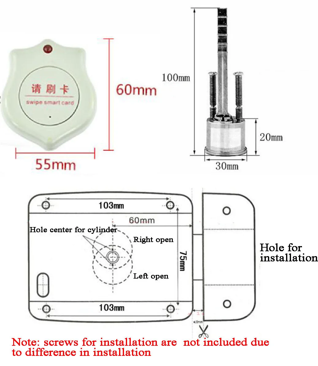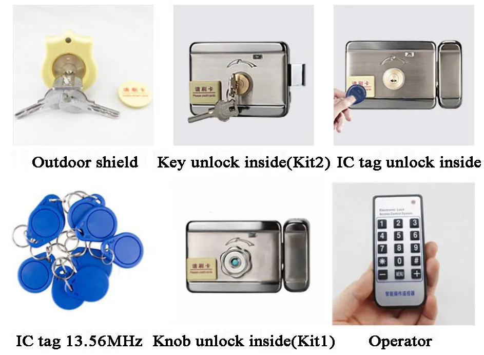 Note: Battery in remote and operator are removedNote: Customs Tax is beyond price.Kit1: TypeA lock +C shield +10pcs ID tag+Key cylinder+3*Keys+Installation Accessories (screws)Kit2: TypeA lock +C shield+10pcs ID tag+Key cylinder+3*Keys+Installation Accessories (screws)+Remote controlKit3: TypeA lock +C shield+10pcs ID tag+Key cylinder+3*Keys+Installation Accessories (screws)+eWelink wifi moduleKit4: TypeA lock +C shield+10pcs ID tag+Key cylinder+3*Keys+Installation Accessories (screws)+eWelink wifi module+Remote controlKit5: TypeB lock +C shield +10pcs ID tag+Key cylinder+3*Keys+Installation Accessories (screws)Kit6: TypeB lock +C shield+10pcs ID tag+Key cylinder+3*Keys+Installation Accessories (screws)+Remote controlKit7: TypeB lock +C shield+10pcs ID tag+Key cylinder+3*Keys+Installation Accessories (screws)+eWelink wifi moduleKit8: TypeB lock +C shield+10pcs ID tag+Key cylinder+3*Keys+Installation Accessories (screws)+eWelink wifi module+Remote controlKit9: TypeA lock +D shield +10pcs ID tag+Key cylinder+3*Keys+Installation Accessories (screws)Kit10: TypeA lock +D shield+10pcs ID tag+Key cylinder+3*Keys+Installation Accessories (screws)+Remote controlKit11: TypeA lock +D shield+10pcs ID tag+Key cylinder+3*Keys+Installation Accessories (screws)+eWelink wifi moduleKit12: TypeA lock +D shield+10pcs ID tag+Key cylinder+3*Keys+Installation Accessories (screws)+eWelink wifi module+Remote controlKit13: TypeB lock +D shield +10pcs ID tag+Key cylinder+3*Keys+Installation Accessories (screws)Kit14: TypeB lock +D shield+10pcs ID tag+Key cylinder+3*Keys+Installation Accessories (screws)+Remote controlKit15: TypeB lock +D shield+10pcs ID tag+Key cylinder+3*Keys+Installation Accessories (screws)+eWelink wifi moduleKit16: TypeB lock +D shield+10pcs ID tag+Key cylinder+3*Keys+Installation Accessories (screws)+eWelink wifi module+Remote controlFeatures:-Suit both Left push/pull and Right push/pull door-NO (open when powered) Fail Secure Operating Mode.Won't open after power off. For lock open after power, please contact us.-High-quality iron, surface dusting technology, durable-Easy to install-User friendly-Support Various unlock method: key(TypeB lock), RFID tag, remote control(optional), phone APP ewlink(optional)-Suit to connect all sorts of access control systems and video door systems-Suit for : home, offices, schools, hotels, factories, warehouses, etc-The outdoor yellow part is waterproof and indoor part is not waterproofSpecifications:Voltage: DV 9 ~ 12VAction Current: less than 350mAOperating Mode: NO (open when powered)Work temperature: -40 Celsius~70 CelsiusWork humidity: less than 95%Response time for RFID tag unlock: less than 0.5S, read distance less than 20mmResponse time for remote control: less than 0.3SNote: Infusing any kind of oil to the lock cylinder is strictly prohibitedPlease pay attention to the difference between TypeA and TypeB lock, and difference between C and D type shield.