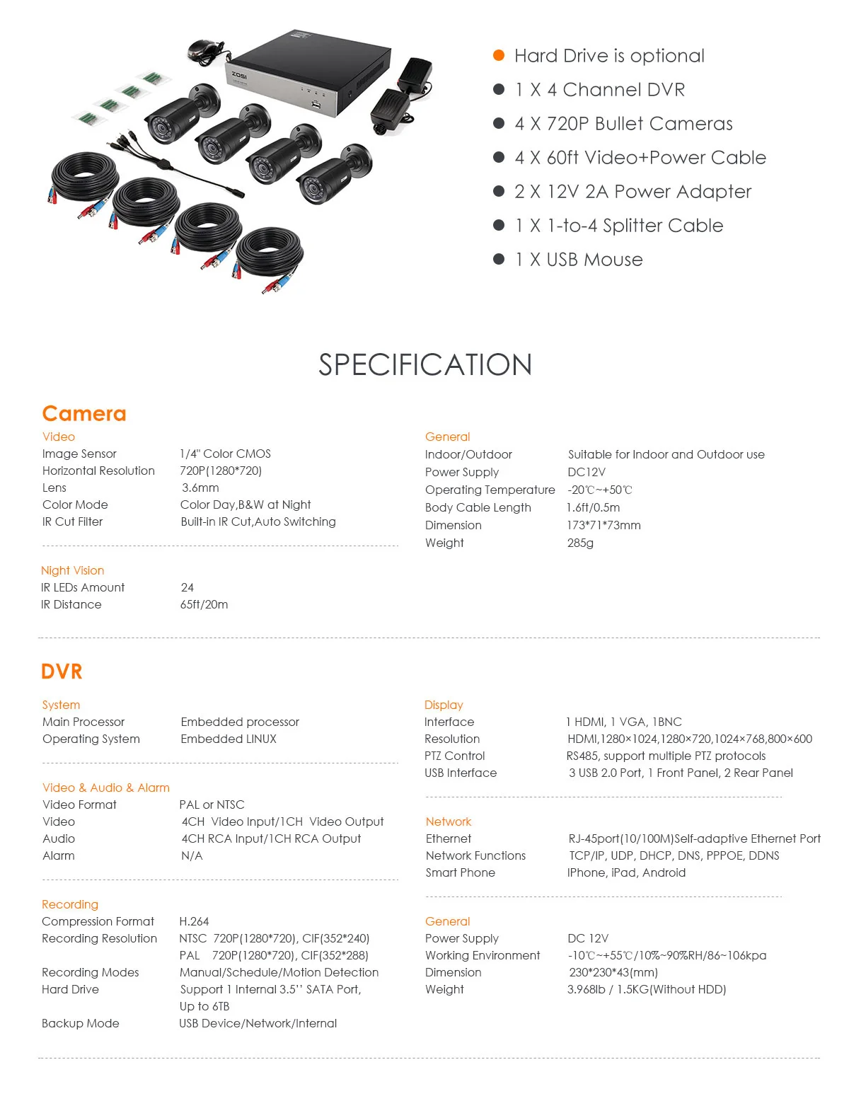 Video compression: H.264Encode capacity: 4x 1080N Video input/ output: 4CH BNC/ 1CH VGA, 1CH HDMIAudio input/ output: 4CH RCA/ 1CH RCARecording , Playback , Backup resolution: 720PUSB: 3x USB 2.0HDD: 1xSATA port (support up to 6TB) 720p 1280TVL Camera Specification