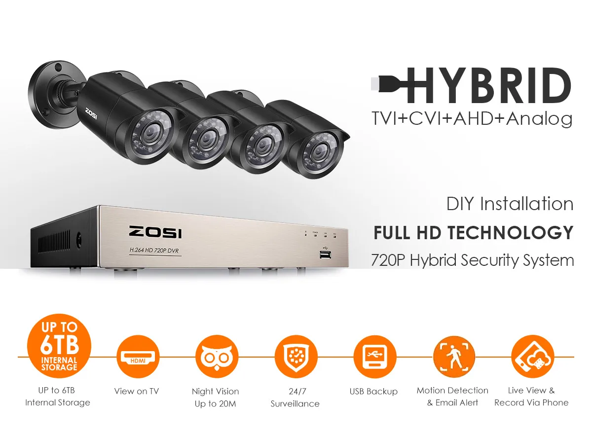 | ZOSI Security Camera System 4CH 1080N CCTV DVR with 4pcs 720P 1.0MP Security Cameras IR outdoor IP66 Video Surveillance kit |