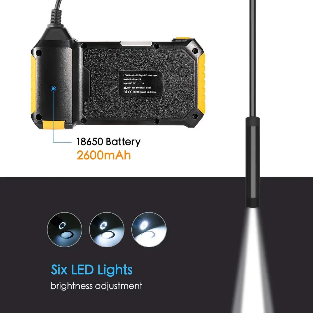 industrial borescope is built-in 2600mAh high capacity lithium battery with working time up to 6 hours. Perfect for underwater pipe, car engine, vent pipe etc, construction, industrial or household use.