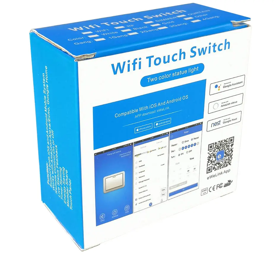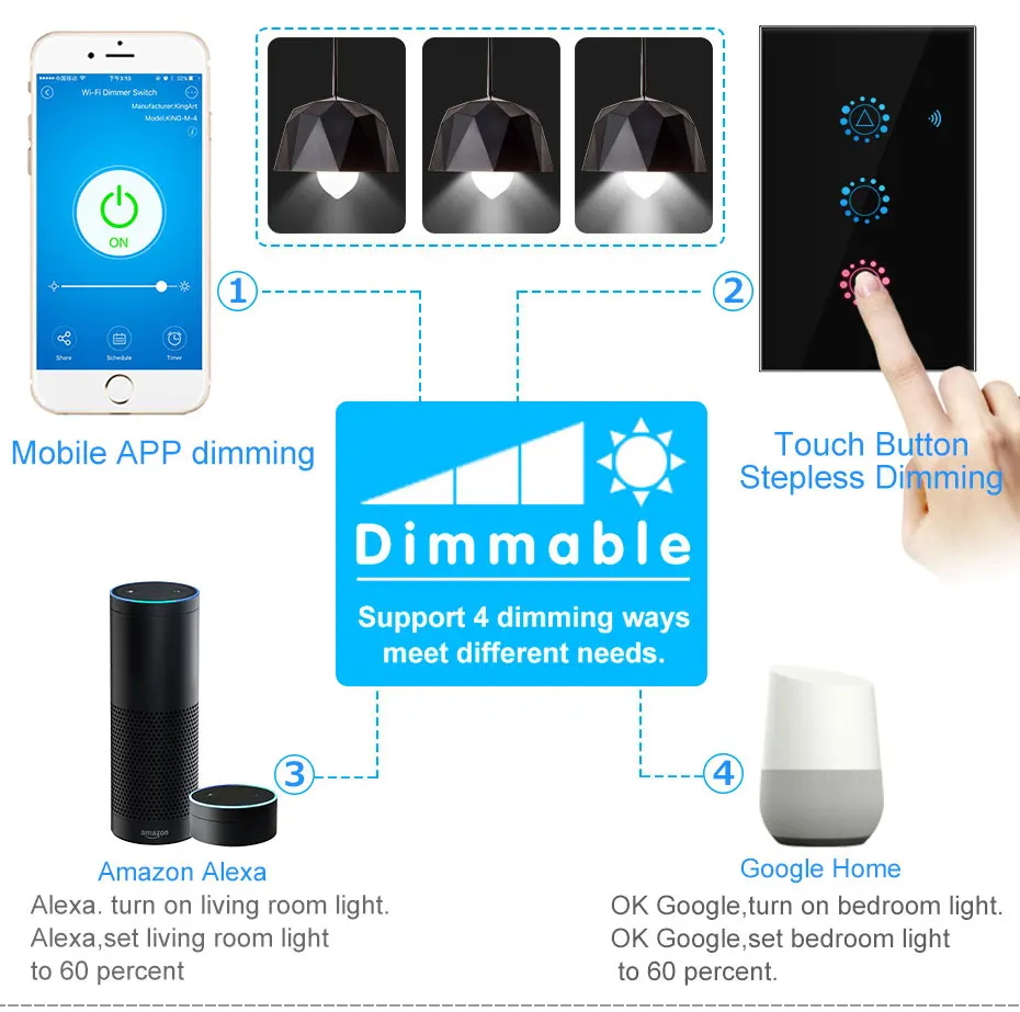 Touch Control: On / Off / DimmingApp Control: On /Off / DimmingStepless DimmingScheduled / Timer / SharesWorks with Amazon AlexaWorks with Google HomeWorks with IFTTTAPP Remote Control: User can use a smartphone to remotely control turn on / off / dimming home electronics at anytime and anywhere via APP as long as the phone has 2G/3G/4G/WIFI network. It makes your home appliances smart in 1 second. Compatible with iOS and Android OS.APP download: eWeLink.Speciffication: