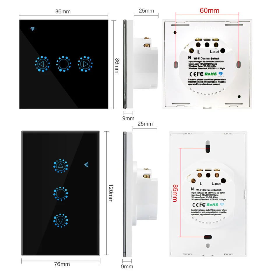 Name: WIFI Smart SwitchColor: Black / WhitePower Supply: 90V-250V ACMax. Current: 2A / 250VMax. Power: 300W / gangWireless: 802.11 b/g/n 2.4GSecurity: WPA-PSK / WPA2-PSKMaterial: ABS + Tempered GlassSize: EU / UK: 86*86*34mm / 3.4*3.4*1.34inch US: 120*76*34mm / 4.7*3*1.34inchCertification: CE, RoHS, FCC Note: