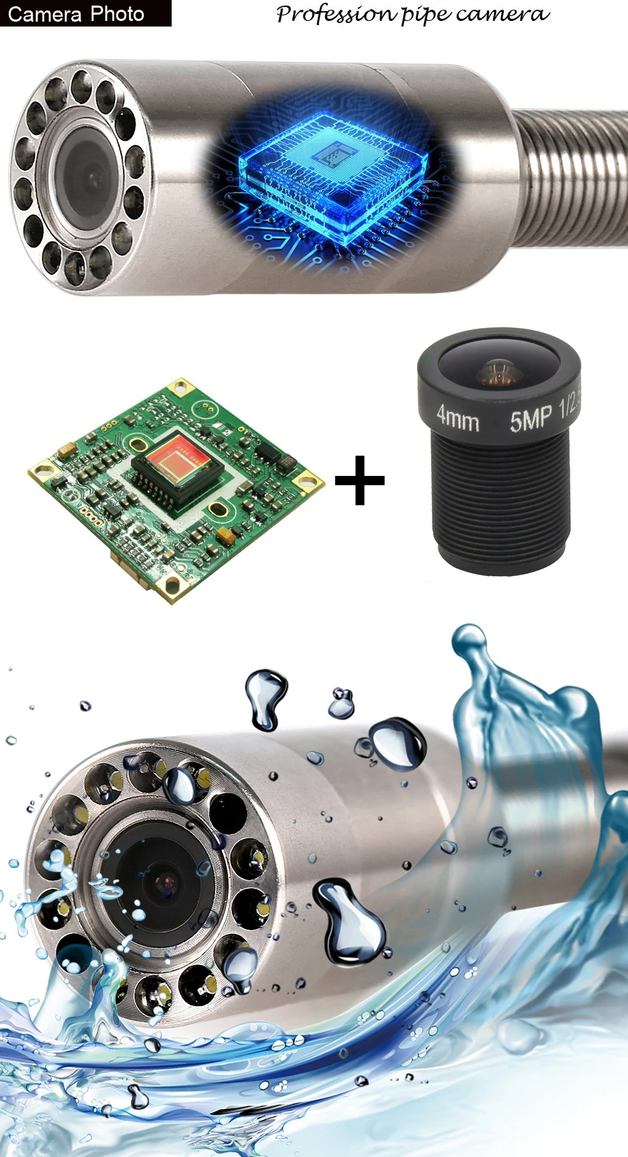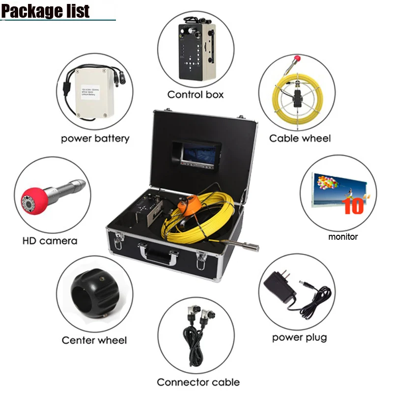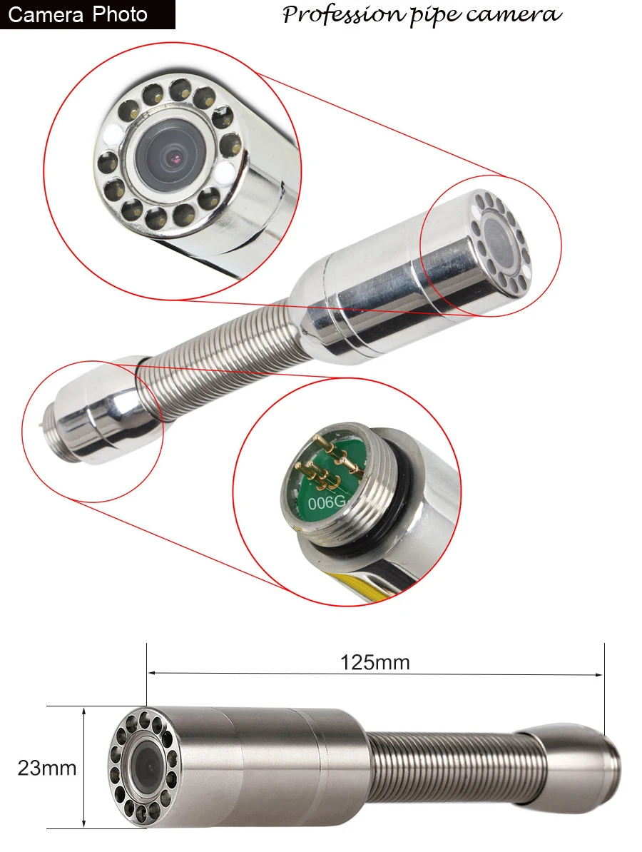 Features Description:OS110-7D1 is a professional, complete video camera system with 23mm diameter camera head and 5mm glass fibers wire for sewer drain pipe snake inspection as well as other applications that not reached by human eyes