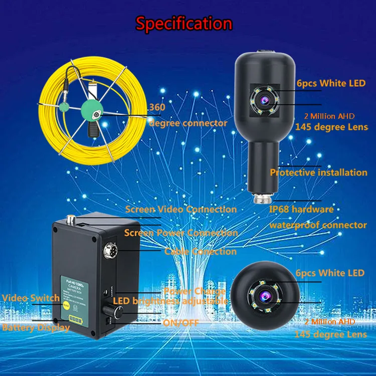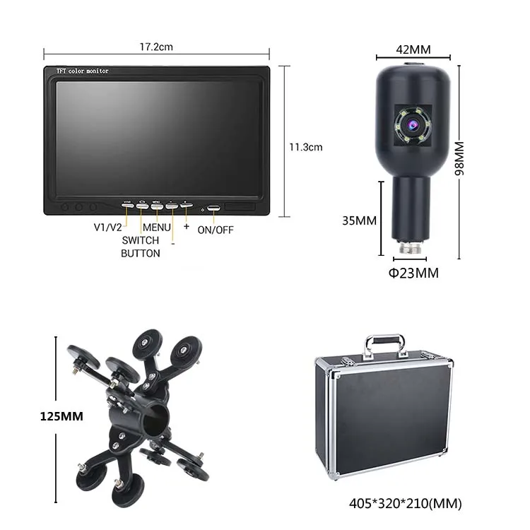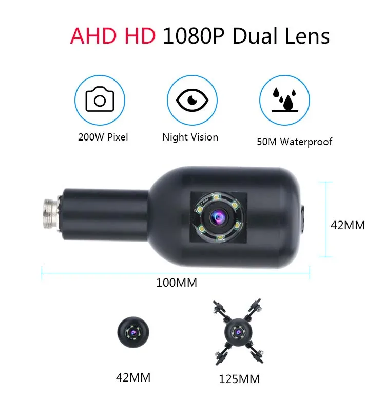 7inch DVR 30M 1080P HD Dual Camera Lens Drain Sewer Pipeline Industrial Endoscope Pipe Inspection Video Camera 【EXCLUSIVE DESIGN DUAL CAMERA LENS】:The pipe inspection camera system has double camera lens,you can observe the pipe from different viewing positions,2 million pixels 1080P Camera. 【DVR RECORDING FUNCTION】: The DVR type deep well inspection camera(Video Resolution:1280*720 ) include 16GB SD card.The monitor built-in card slot,You can record the inspections and playback on PC with card reader. 【FULL WATERPROOF】:This drain pipe sewer pipeline inspection camera video adopts IP68 waterproof technology and 20-200 meters cold-resistant, anti-corrosion,pull-resistant fiberglass cable(5mm-in-diameter). 【7/10 INCH HIGH-RESOLUTION MONITOR UPGRADED】:IPS High-resolution display more realistic and delicate.This waterproof pipe plumbing inspection camera with removable sun-visor you can enjoy the video even under strong sunshine. 【PORTABLE&LONG BATTERY】:High quality aluminum box,easy to carry and use.High capacity recharge lithium battery keep 6-8H working time when the battery is full charged. 【Support for Part Replacement & Fast Customer Service】: If you need assistance, including pre-order/after-sales service, please do not hesitate to contact us.All MAOTEWANG pipeline inspection camera spare parts/accessories for repair or replacement,factory offer very cheap price,you do not need to worry about the cost and availability of the replacements. Specification: Camera and cable: Sensor Resolution :DUAL CAMERA 1/3 CMOS AHD 1080P 2 million pixels Camera Diameter :42(MM)*98(MM) Camera Protective Case Diameter:125(MM) Depth/Material: 30M/50M (optional)/fiber tube(diameter: 5MM) LED: 6pcs 6W LED(Brightness can be adjustable) Angle: 145 degree Camera Material: Plastic steel Waterproof Level: IP68 Monitor: Size:7 inch IPS Display Resolution: 1024*600 Function: Video Record Record / Monitor Image: Color Video Resolution: 1280*700 SD Card: Max support 64GB SD card; includes 16G SD card Menu:Chinese /English Optional/русский Power Bank: Recharger: DC 12V 1200mA Recharge time: about 5 hours Battery capacity: lithium battery12V 4500AH Battery working time: about 6-8 hours Aluminum box size: 410*370*180mm Package List: 1 * 7 inch IPS Monitor 1 * 16GB SD Card 1 * HD 1080P Dual Camera 1 * 30M Fiberglass Cable 1 * Camera Proof Cover 1 * 4500mah Power bank 1 * Charger 1 * Screw Driver 1 * Aluminum box 1 * User Manual (English)