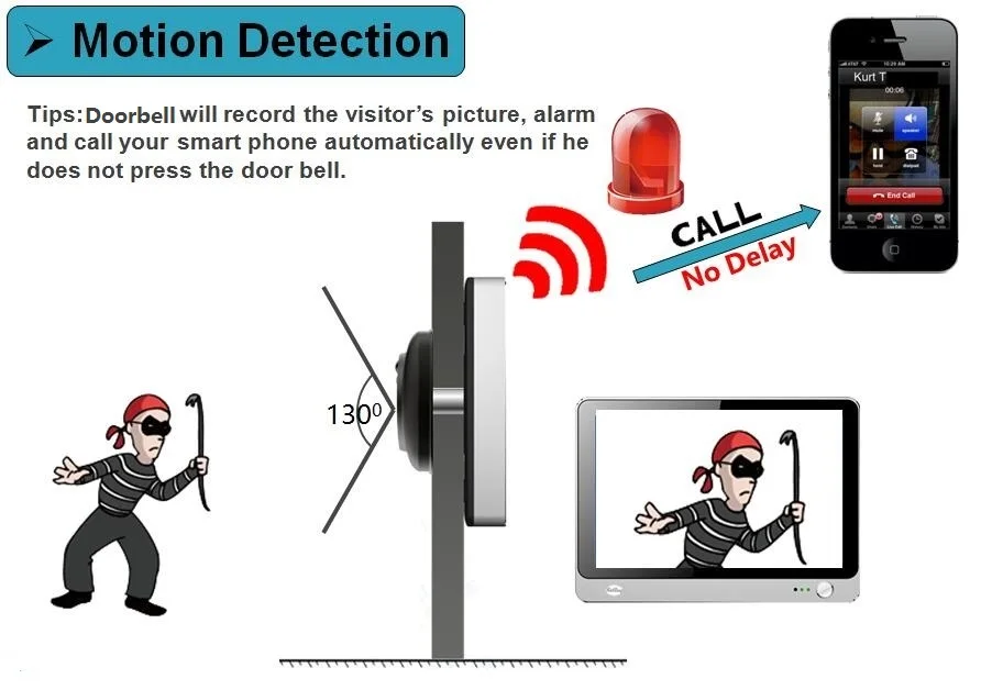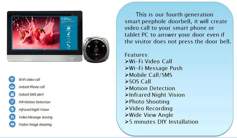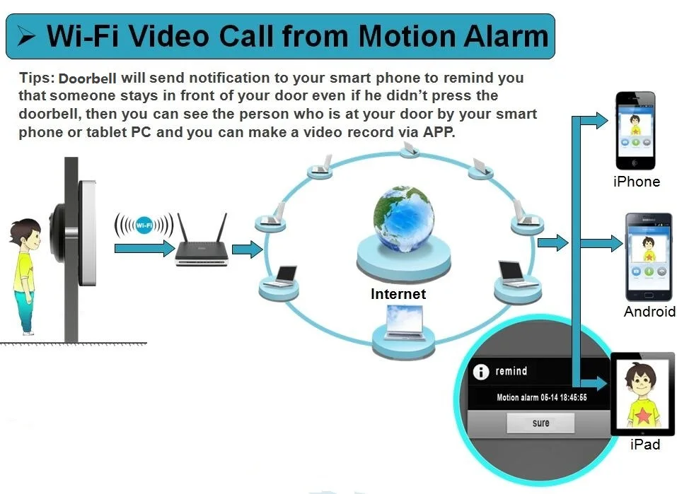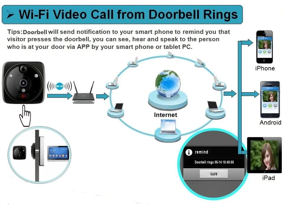 Wi-Fi Video CallAnswer your door by smartphone, just need to press a button to make video call, can see who is at your door remotely