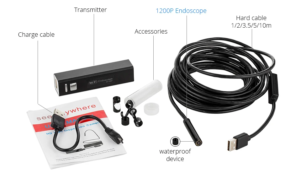 | Fuers 8mm 1200P HD WiFi Inspection Camera IP68 Waterproof USB Endoscope Borescope support Android IOS Iphone Windows Mac Systems |