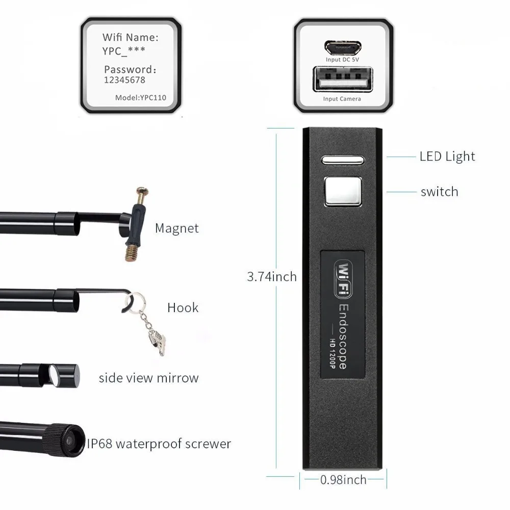 Feature 8 Adjustable Mini 8mm LED lens Turn the power switch,indicator on the wifi device lights up.This rotary switch is similar with a light modulator,turning it can also adjust the brightness of lens LED light. When it is used in darker environment,the illuminating light can be turned on to increase the brightness. Featuring IP68 waterproof camera and cable allows it to work in multiple environment (please install waterproof device) Li-lon Rechargeable Battery easy to use and protable flexible tube This is flexible tube can be bent into any shape which will be convenient for entering into any zones to check for you. Three kinds of attachments (hook,mirror and magnet) can help you to find out any small objects,such as ring or small screws. Applicable Scenarios